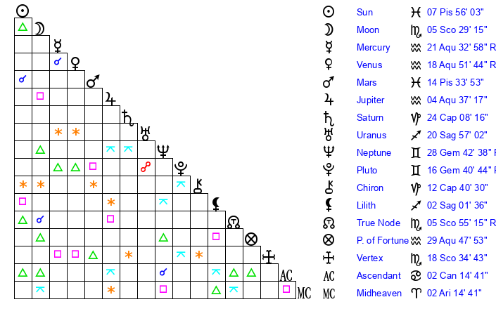 | Sun | 7 Pisces 56 | 9 Pisces 6 | 7 Cancer 42 |