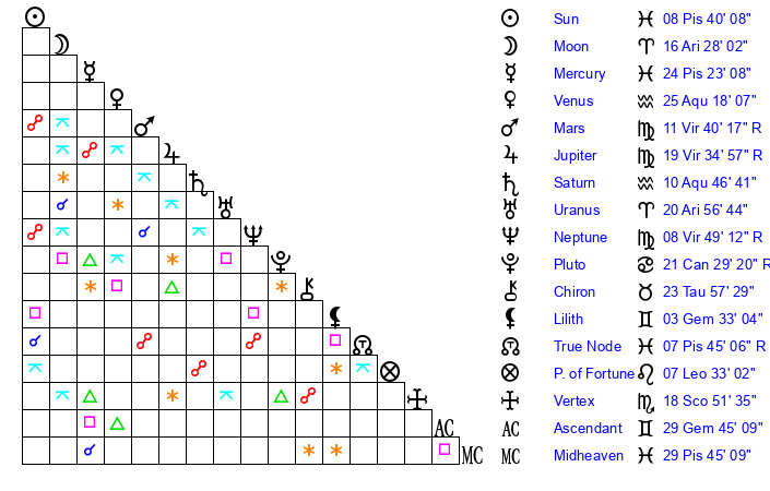 | Sun | 8 Pisces 40 | 9 Pisces 21 | 8 Gemini 48 |