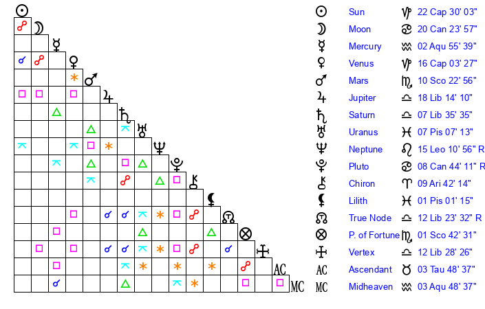 | Venus | 16 Capricorn 3 | 10 Pisces 38 | 24 Taurus 22 |