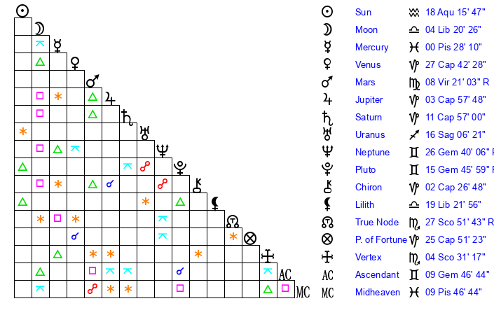 | Pluto | 15 Gemini 46 | 2 Aquarius 15 | 17 Gemini 15 |