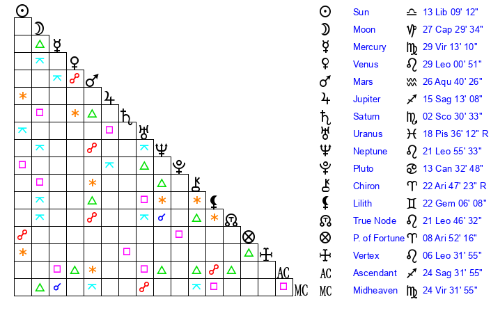 | Moon | 27 Capricorn 27 | 7 Aries 24 | 27 Virgo 32 |