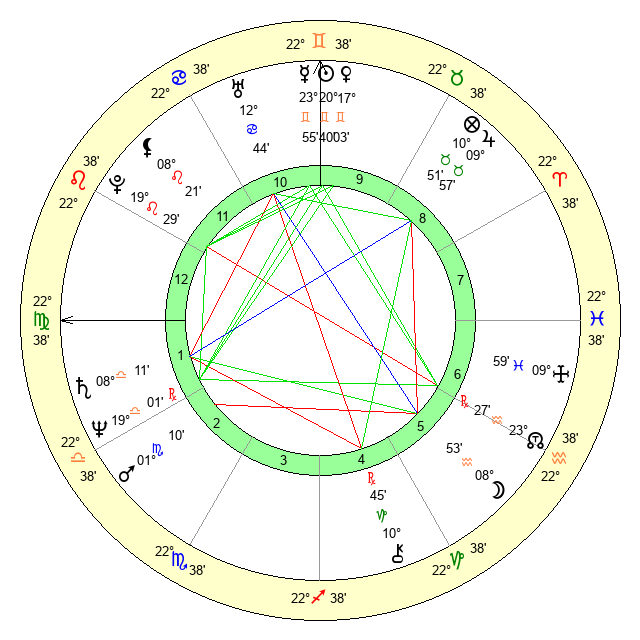| Sun | 20 Gemini 41 | 21 Gemini 1 | 0 Virgo 29 |