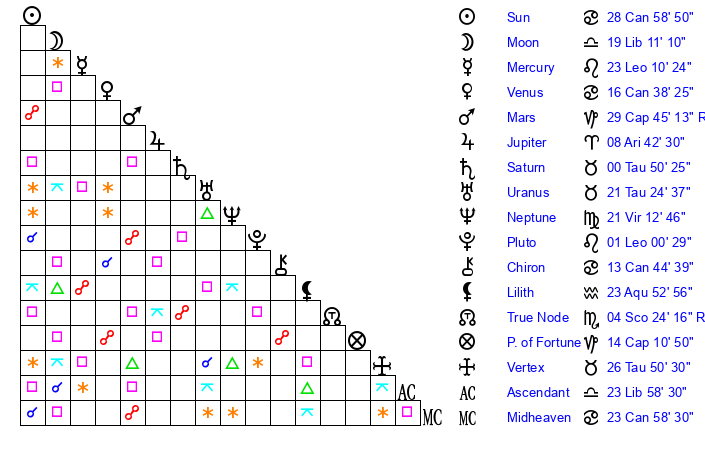| Sun | 28 Cancer 58 | 0 Leo 8 | 22 Libra 25 |