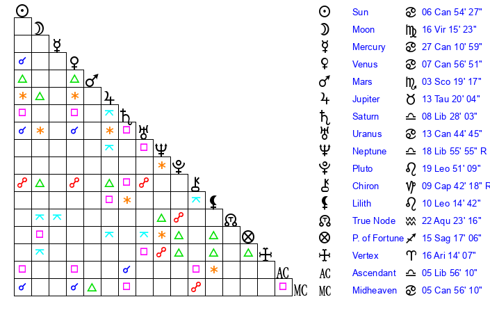 | Sun | 6 Cancer 54 | 7 Cancer 15 | 16 Virgo 56 |