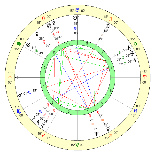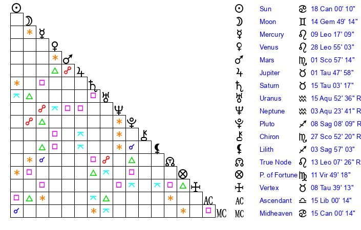 | Moon | 14 Gemini 47 | 16 Capricorn 59 | 25 Taurus 44 |