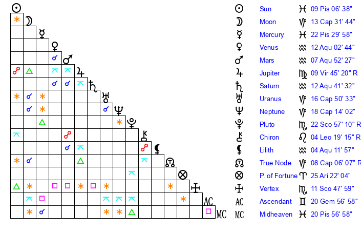 Moon | 13 Capricorn 26 | 15 Pisces 52 | 21 Pisces 36 |