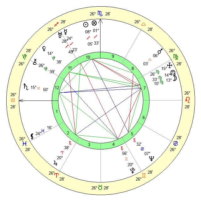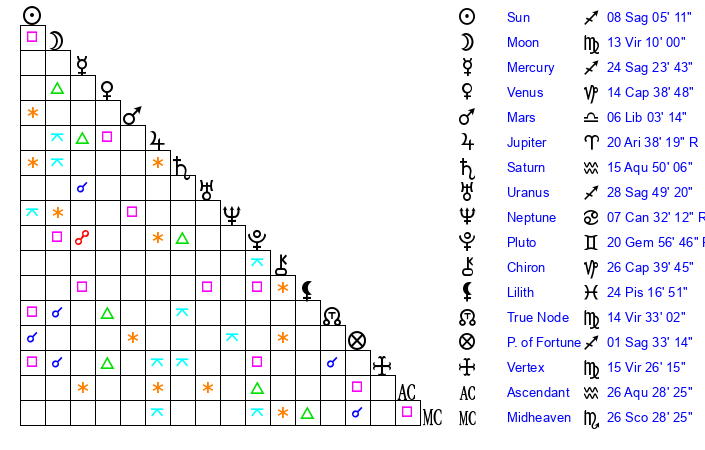 | Moon | 13 Virgo 8 | 9 Aries 25 | 23 Aquarius 54 |