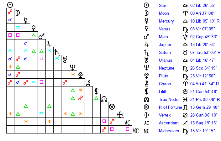 | Moon | 0 Aries 34 | 15 Scorpio 55 | 19 Aries 4 |