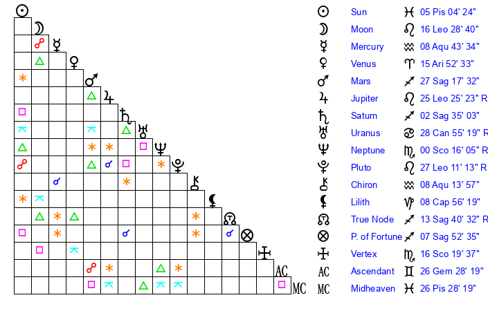 | Moon | 16 Leo 41 | 22 Capricorn 44 | 19 Aquarius 27 |