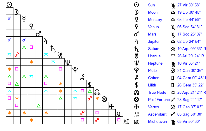 | Moon | 19 Libra 31 | 24 Virgo 21 | 13 Pisces 2 |