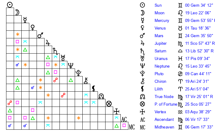 | Sun | 0 Gemini 34 | 1 Gemini 51 | 8 Virgo 13 |