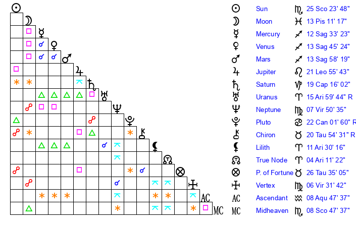 | Moon | 13 Pisces 19 | 9 Scorpio 28 | 12 Leo 21 |