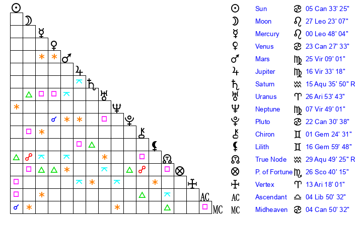 | Moon | 27 Leo 26 | 6 Leo 16 | 17 Capricorn 59 |