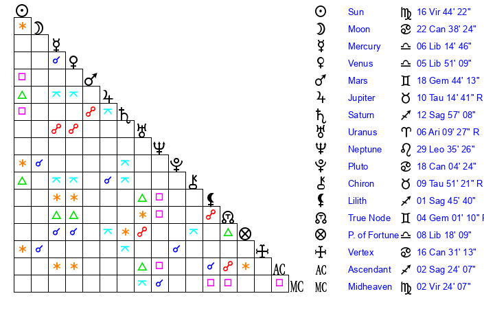 | Sun | 16 Virgo 45 | 17 Virgo 16 | 23 Sagittarius 30 |