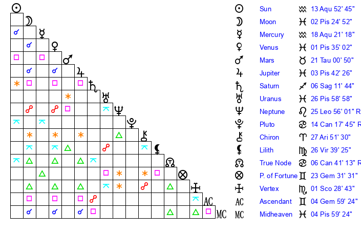 | Venus | 1 Pisces 36 | 29 Pisces 32 | 0 Cancer 24 |