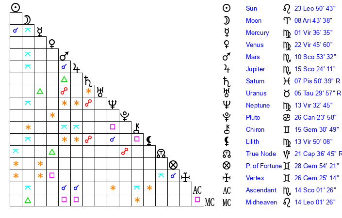 | Sun | 23 Leo 50 | 25 Leo 2 | 22 Scorpio 24 |