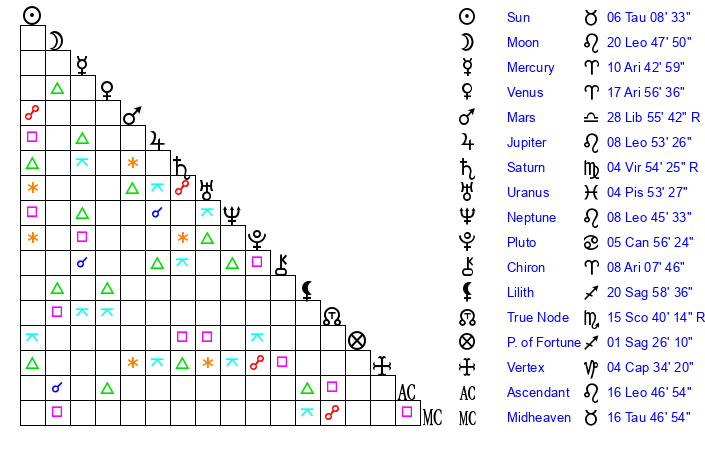 | Moon | 20 Leo 54 | 21 Aries 2 | 15 Gemini 15 |