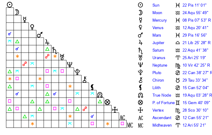 | Saturn | 22 Aquarius 50 | 22 Pisces 9 | 28 Aquarius 19 |