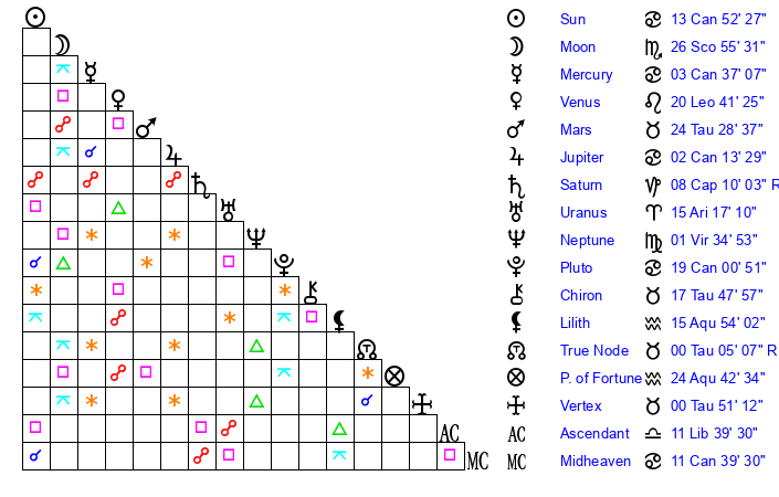 | Moon | 26 Scorpio 53 | 27 Scorpio 25 | 7 Taurus 50 |