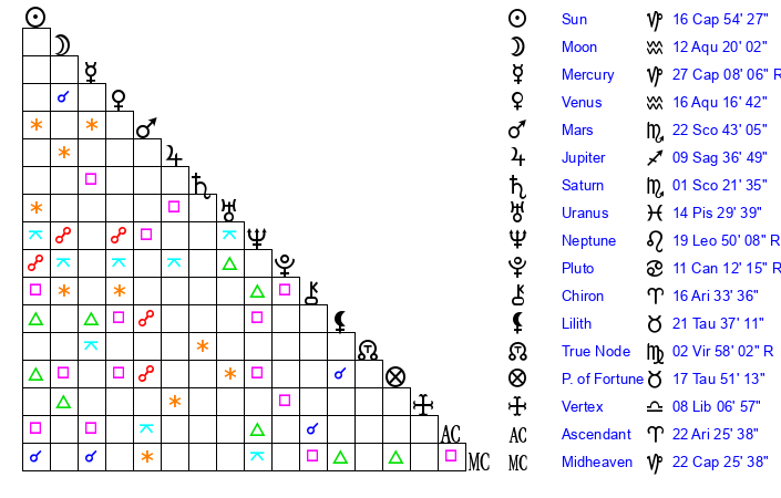 | Sun | 16 Capricorn 54 | 18 Capricorn 25 | 28 Aries 8 |