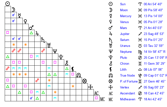| Sun | 0 Aries 54 | 1 Aries 20 | 27 Gemini 14 |