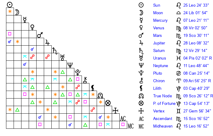 | Moon | 24 Libra 10 | 28 Gemini 39 | 26 Leo 28 |