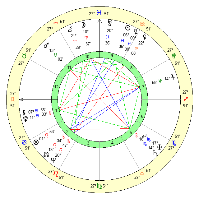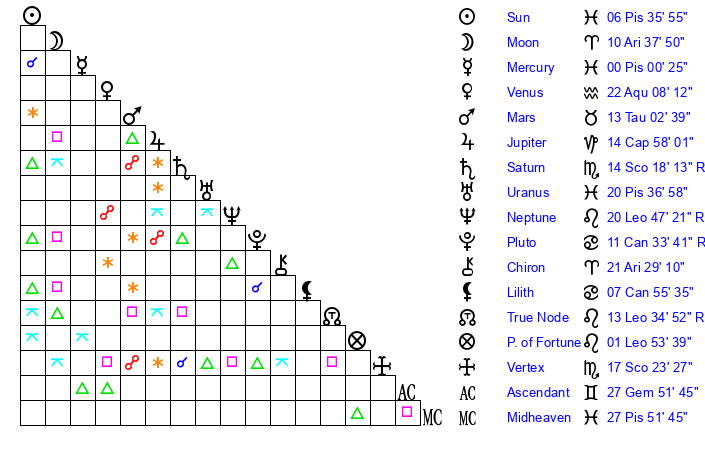 | Moon | 10 Aries 39 | 6 Aquarius 26 | 27 Scorpio 46 |