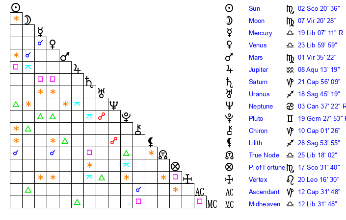| Moon | 7 Virgo 15 | 0 Capricorn 6 | 28 Aquarius 44 |