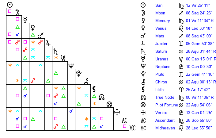 | Sun | 12 Virgo 26 | 13 Virgo 23 | 12 Capricorn 26 |