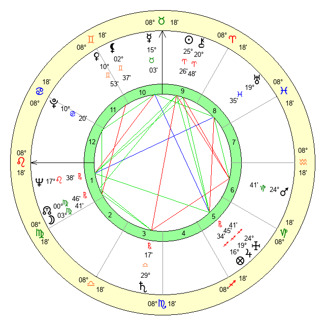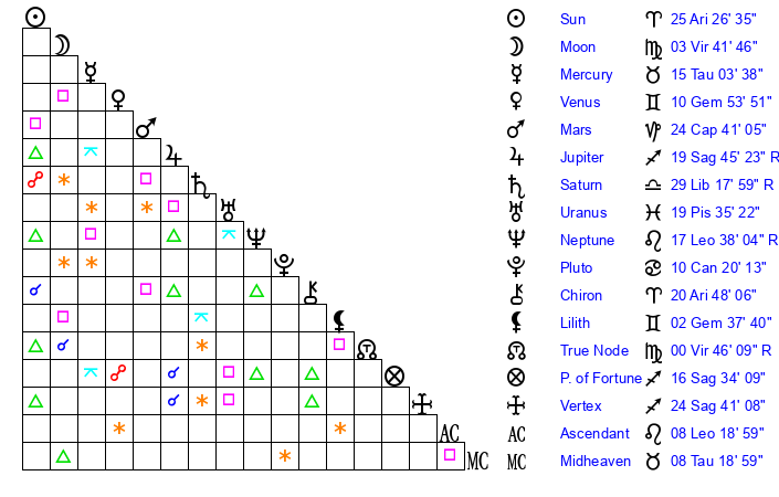 | Moon | 3 Virgo 41 | 25 Scorpio 10 | 24 Taurus 47 |