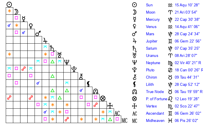 | Sun | 15 Aquarius 10 | 16 Aquarius 8 | 19 Taurus 18 |