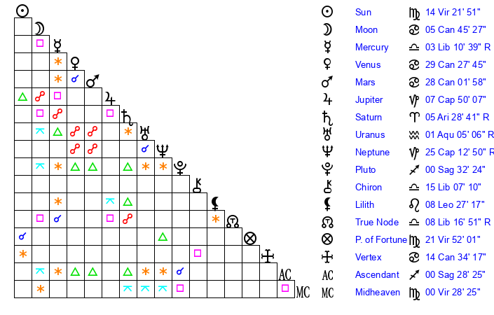 | Sun | 14 Virgo 22 | 14 Virgo 21 | 12 Libra 44 |