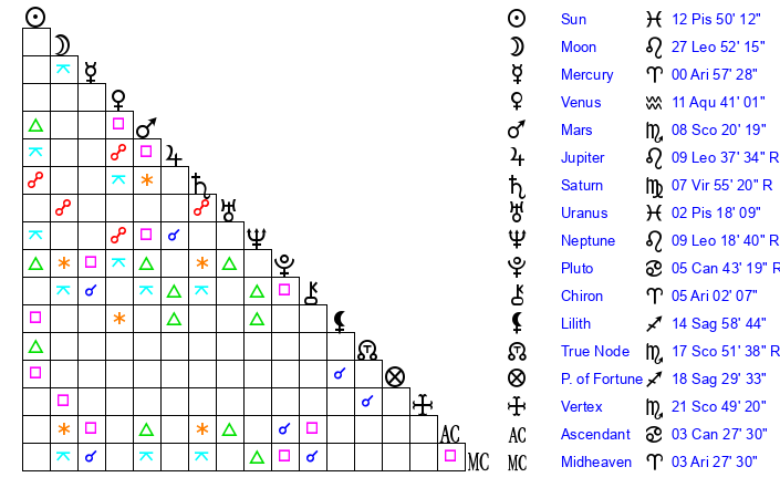 | Neptune | 9 Leo 18 | 28 Pisces 59 | 9 Leo 37 |
