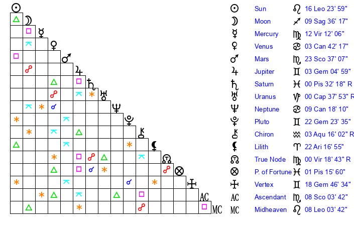 | Sun | 16 Leo 24 | 17 Leo 21 | 14 Sagittarius 57 |