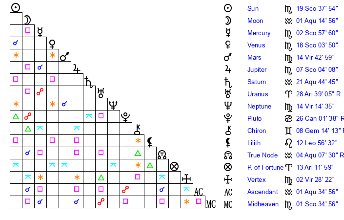 | Sun | 19 Scorpio 37 | 20 Scorpio 34 | 22 Aquarius 3 |