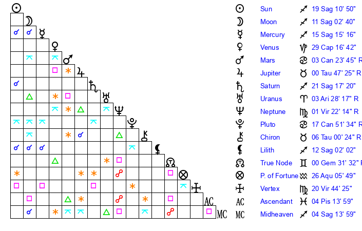 | Sun | 19 Sagittarius 11 | 19 Sagittarius 54 | 26 Pisces 23 |