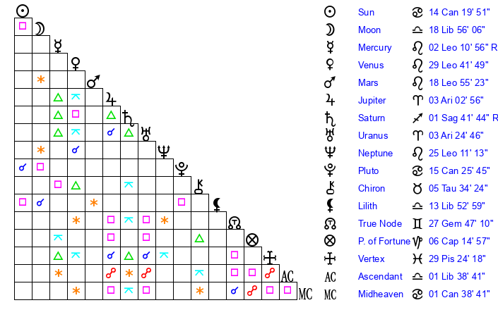 | Moon | 19 Libra 28 | 6 Sagittarius 58 | 25 Taurus 58 |