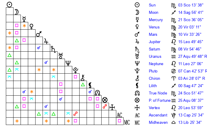 | Mercury | 21 Scorpio 36 | 28 Scorpio 9 | 24 Aquarius 24 |