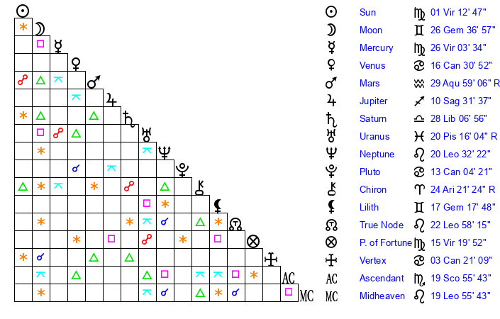 | Mercury | 26 Virgo 4 | 14 Leo 36 | 0 Capricorn 57 |