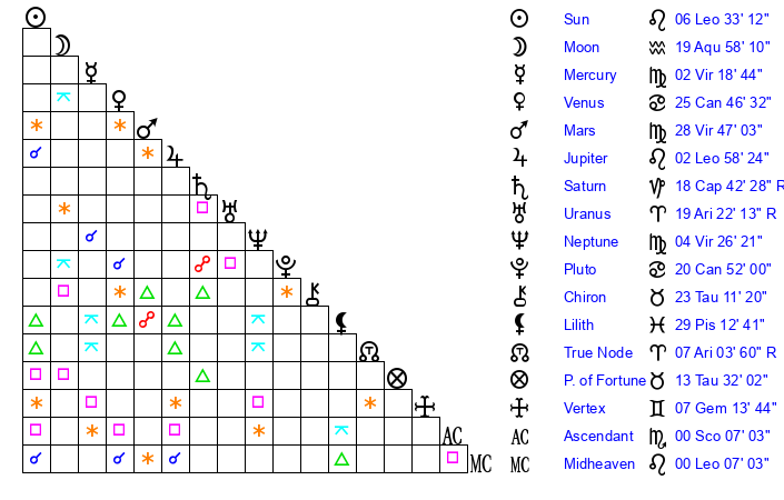 | Neptune | 4 Virgo 27 | 1 Aries 59 | 7 Virgo 33 |