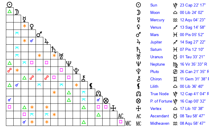 | Sun | 23 Capricorn 22 | 24 Capricorn 47 | 22 Aries 36 |