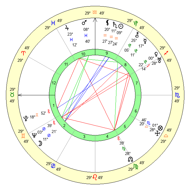 | Sun | 9 Aquarius 24 | 11 Aquarius 3 | 8 Gemini 49 |