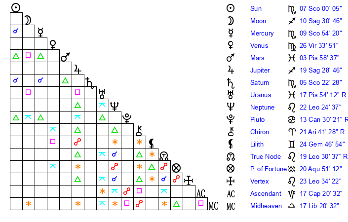 | Moon | 10 Sagittarius 17 | 19 Aquarius 41 | 17 Leo 16 |