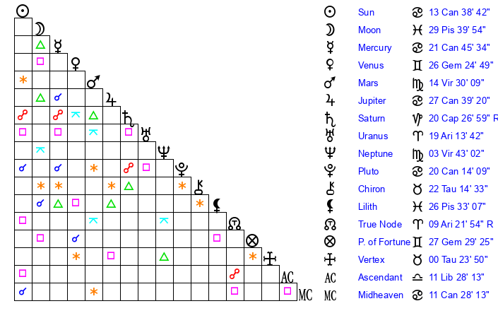 | Moon | 29 Pisces 37 | 27 Scorpio 25 | 4 Virgo 32 |