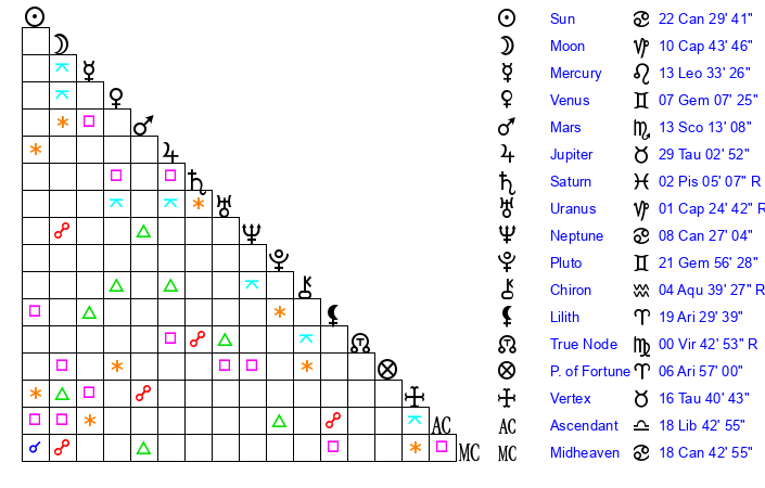 | Pluto | 21 Gemini 57 | 2 Aquarius 48 | 22 Gemini 19 |