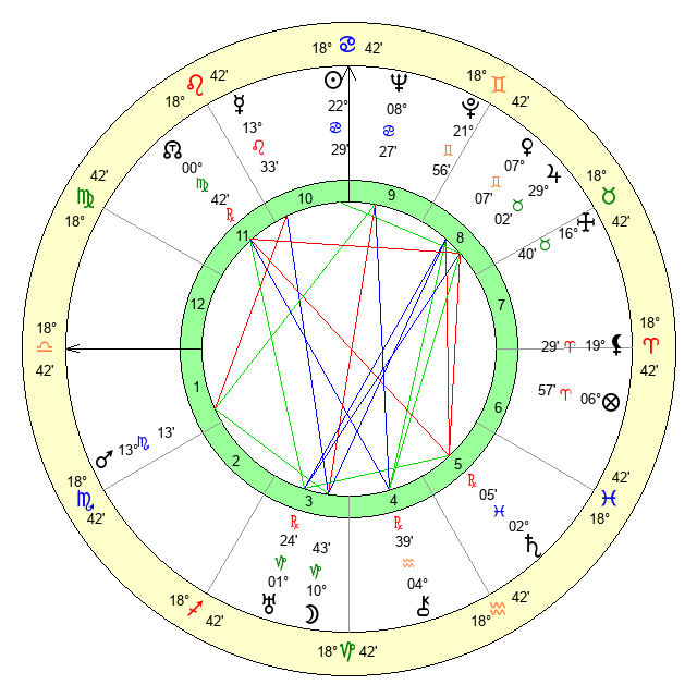 | Sun | 22 Cancer 30 | 23 Cancer 27 | 19 Scorpio 39 |