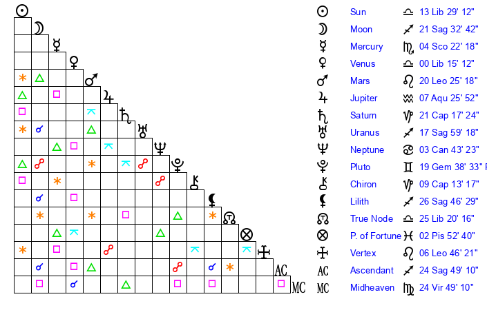 | Moon | 21 Sagittarius 38 | 22 Aries 13 | 17 Gemini 47 |