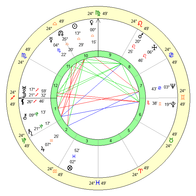 | Venus | 0 Libra 15 | 22 Virgo 21 | 4 Pisces 36 |