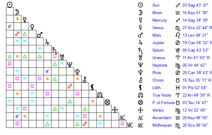 | Moon | 16 Aquarius 59 | 15 Aquarius 58 | 1 Leo 42 |