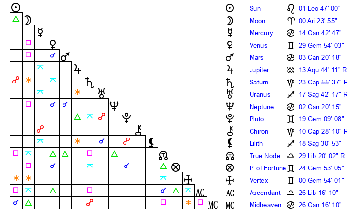 | Mercury | 14 Cancer 43 | 13 Leo 20 | 23 Scorpio 9 |